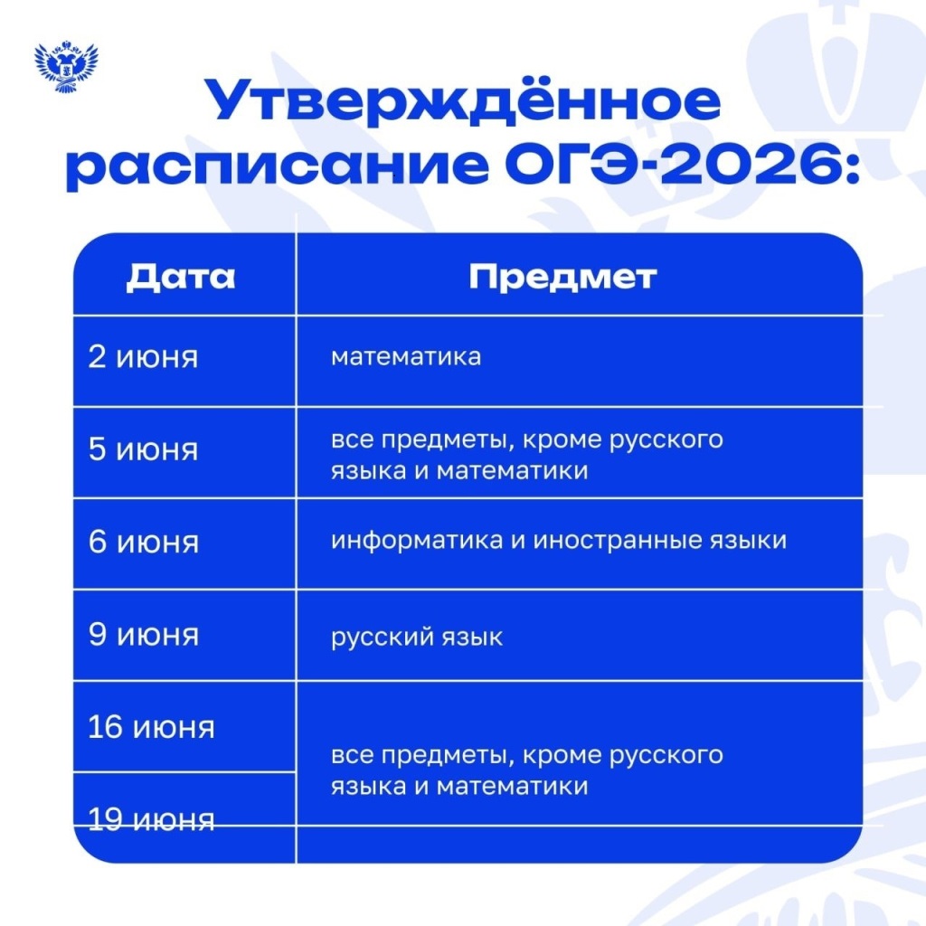 Для ОГЭ основной период включает 2 июня – математику, 6 июня – информатику и иностранные языки, 9 июня – русский язык, а также 5, 16 и 19 июня – остальные предметы. Резервные дни: 29 июня (математика), 2 июля (русский), 3 и 6 июля (прочие предметы).